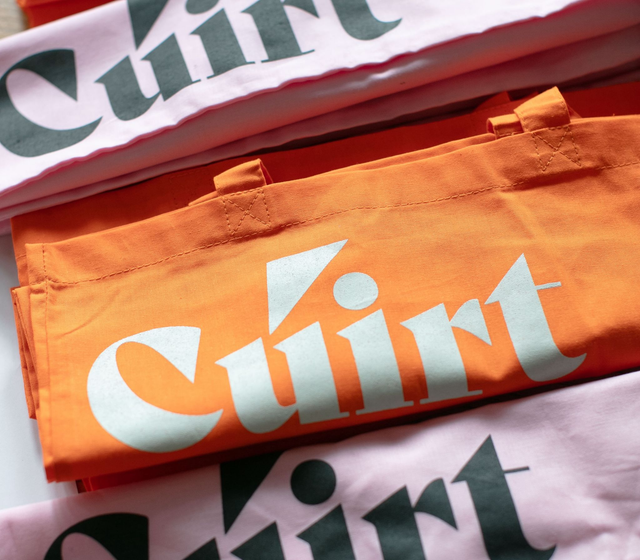 Orange tote bag with Cúirt logo.